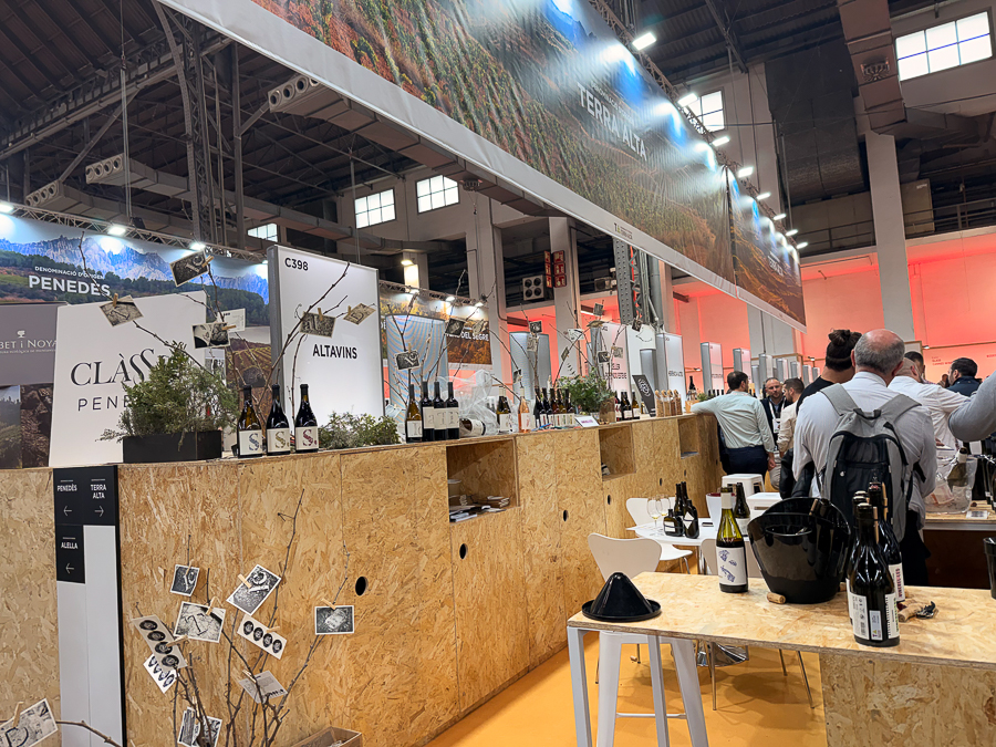 Detalle del stand de Altavins en la Barcelona Wine Week, con sus vinos expuestos para la cata profesional.