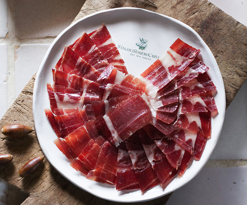 Sánchez Romero Carvajal trabaja únicamente con cerdos 100% ibéricos criados en libertad en las dehesas del sur peninsular y alimentados con bellotas durante la montanera. La marca supera con creces los requisitos de la normativa y ofrece a cada animal más del doble de superficie de campo de la que se exige. La brida negra, distintivo de excelencia, certifica su origen, raza y alimentación.