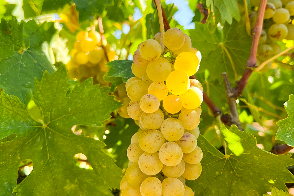 Racimo de muscat en viñedo del Penedès, base aromática de vinos como Anais Muscat de U MES U.