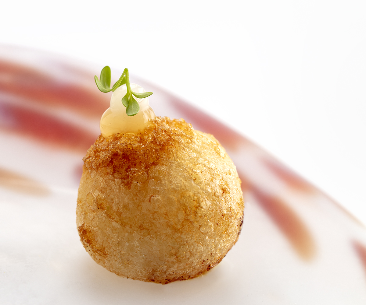 Buñuelo de rabo de toro con perlas de yuzu. El contraste entre la cocina tradicional y el toque cítrico demuestra la versatilidad de la esferificación en recetas saladas